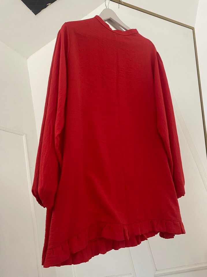 Kırmızı pamuklu keten kumaştan, uzun kollu, yüksek yakalı, salaş kesim ve asimetrik drapeli tunik.