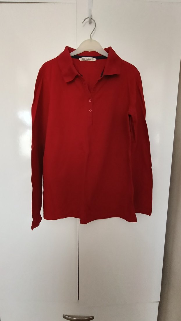 Kırmızı uzun kollu lacoste kumaş, yakalı ve düğmeli. Bir kez giyildi.47*61 Sorunsuz defosuz