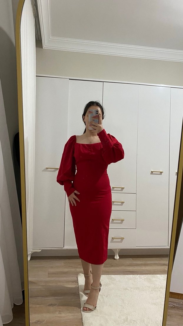 Kırmızı Uzun Kollu Midi Elbise