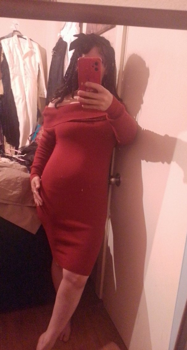 Koyu kırmızı, uzun kollu, yüksek yakalı, drapeli ve saten dokulu hamile elbisesi, midi boyda ve vücuda oturan kesimdedir. Romantik akşamlar için uygundur.beden bilgisi yok 54 kilo 1 60boyy likralı kumaş triko çok rahat tarz harkulede burda denendi sadece hiç giyilmedi✨