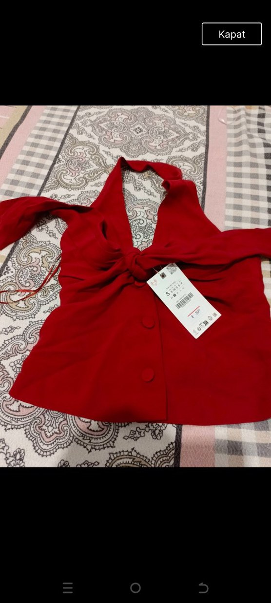 Dar kesim, uzun kollu kırmızı bluz, halter yaka ve düğme detaylarına sahip. Sentetik kumaştan, baskılı deseniyle sokak modası tarzında, romantik akşamlar için uygundur Zara markası orijinal üründür