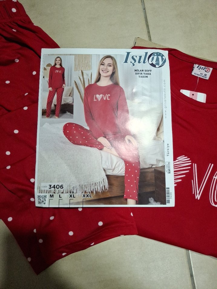 Kadın pijama takımı, bol kesim, uzun kollu ve kısa boyda. Açık kırmızı renkli, baskılı desenli ve yumuşak kumaştan üretilmiştir. XL beden mevcuttur.