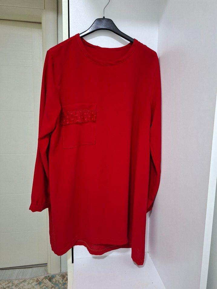 Kırmızı uzun kollu, yuvarlak yakalı, bol kesim tunik. Yumuşak , drapeli ve nakışlı detaylara sahip. Günlük kullanım için uygundur. kendi dikimimdir