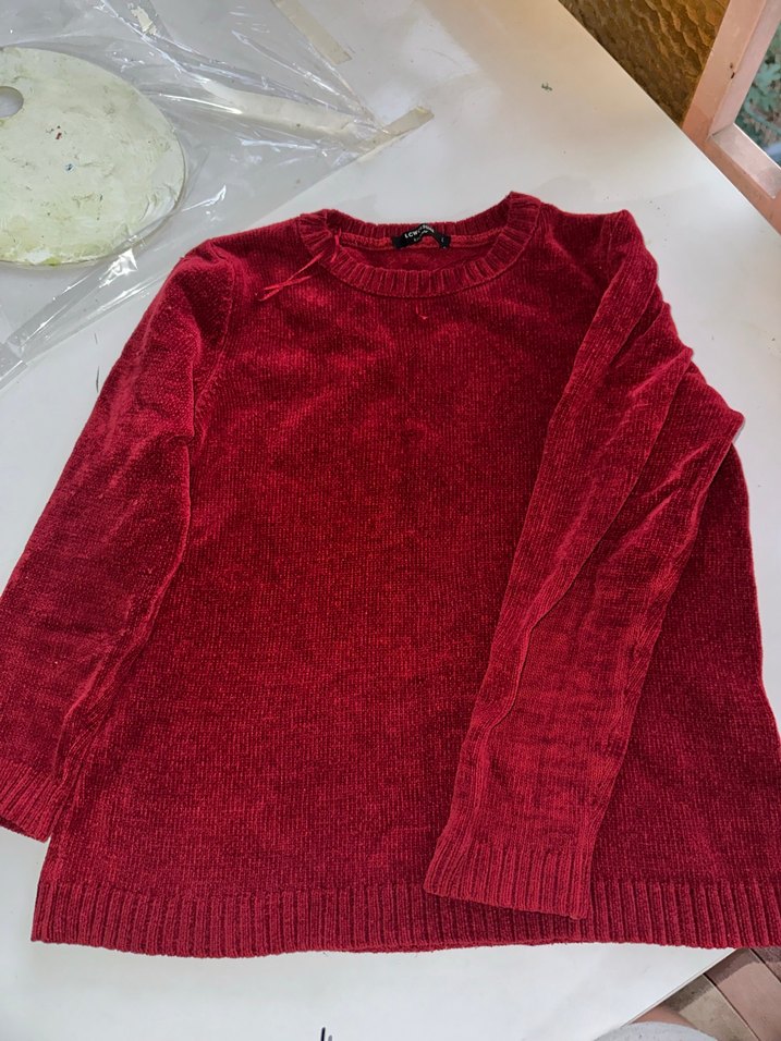 Koyu kırmızı, uzun kollu, yuvarlak yakalı kadın kazak. Örgü dokusu ve bol kesimiyle yumuşak, sıcak kumaştan yapılmıştır.