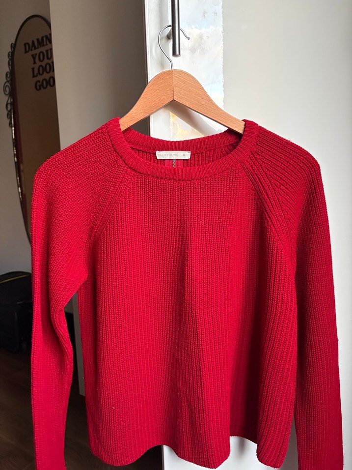 Kırmızı renkli, yün örgü, bisiklet yaka ve uzun kollu, bol kesim kadın kazak. Düz ve desensiz, normal boyda, rahat ve günlük kullanıma uygun.