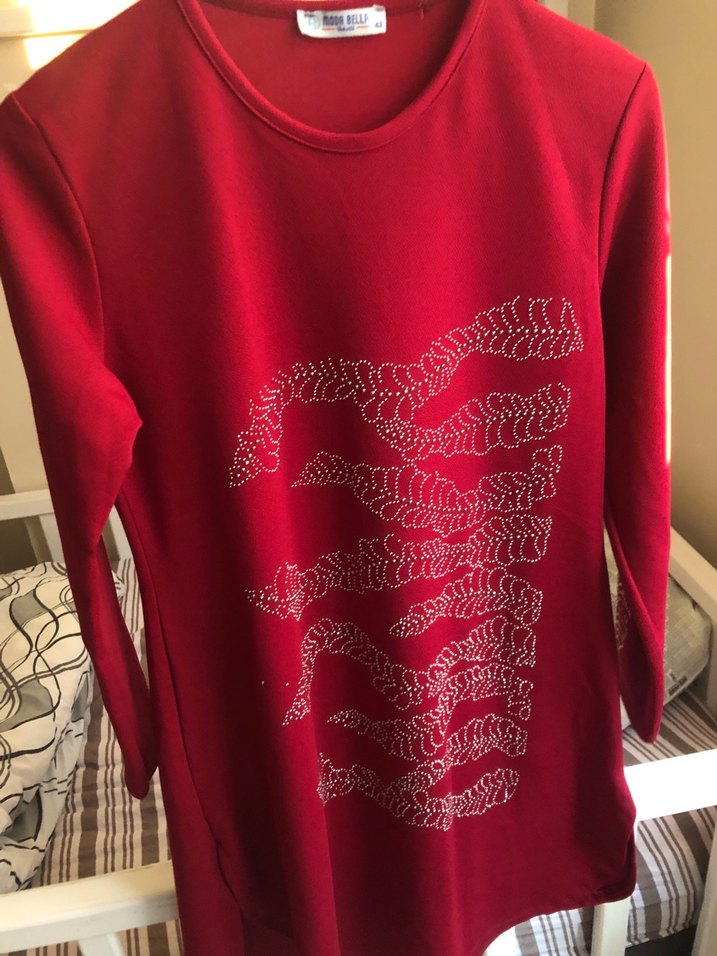 Uzun kollu, yuvarlak yakalı kırmızı tunik, payet işlemeli baskı deseni ve bol kesimiyle rahat bir görünüm sunar. Sentetik kumaştan üretilmiştir. ✨