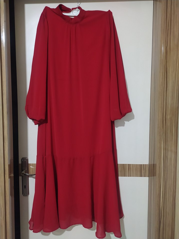 Koyu kırmızı renkte, yüksek yakalı ve uzun kollu, salaş kesim ve drapeli uzun elbise. Sentetik kumaştan, minimalist ve sade ofis stili için uygundur.