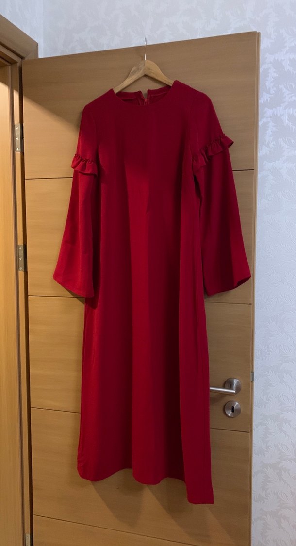 Yumuşak, krep kumaştan yapılmış, yüksek yakalı, salaş kesim uzun kırmızı elbise. Kollarında hafif fırfırlar ve drapeler bulunur. Boy: 132 cm Göğüs: 105 cm Basen: 116 cm