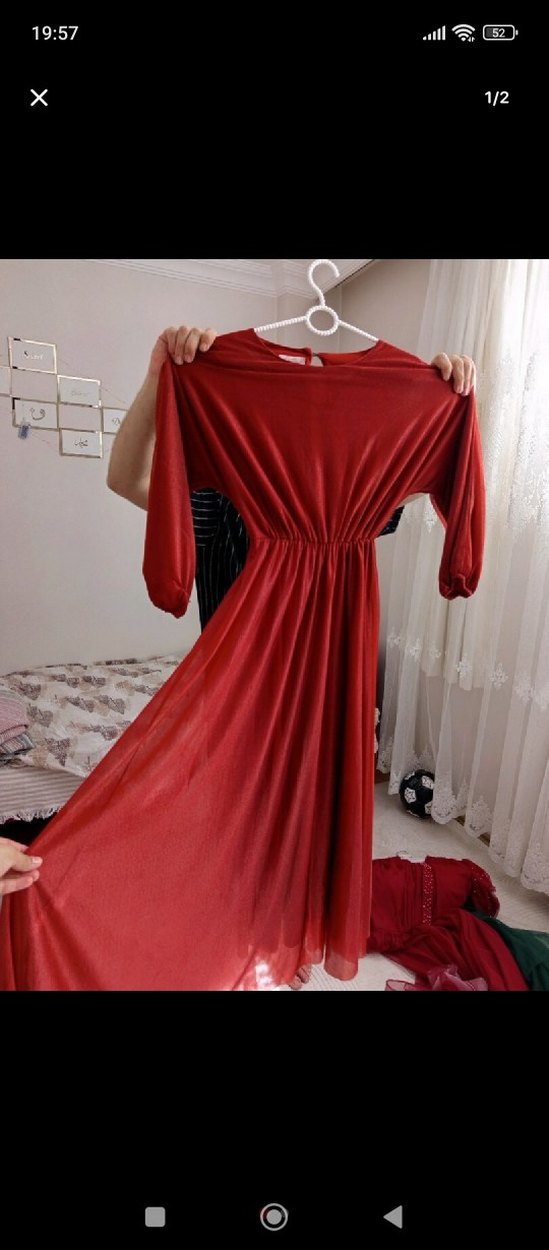 Kırmızı uzun kollu, salaş kesim ve drapeli detaylara sahip elbise. İpek gibi parlak kumaştan, V yaka ve bohem tarzda.