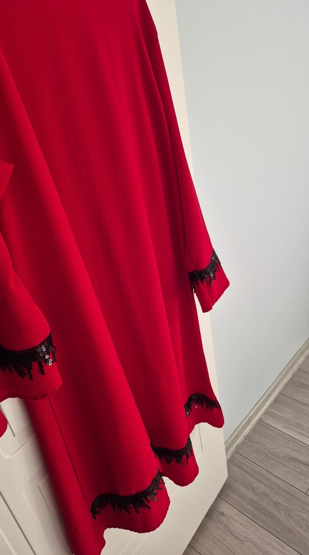 Kırmızı uzun kollu, salaş kesim elbise. Drapeli tasarım ve nakış detayları bulunur. V yaka ve parlak kumaşlı, romantik akşamlar için uygundur. Tesettürlü bayanlar tunik olarak kullanabılır❤️
