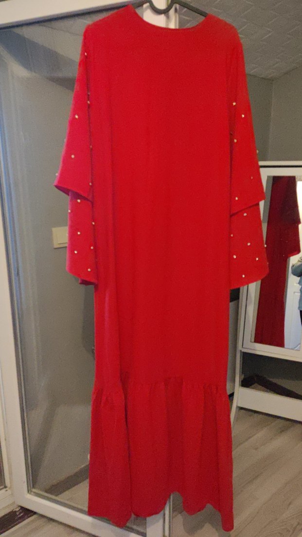 Kırmızı uzun kollu, dökümlü ve parlak sentetik kumaştan salaş kesim kadın elbisesi, günlük kullanıma uygundur. ✨42/46 beden uyumludur