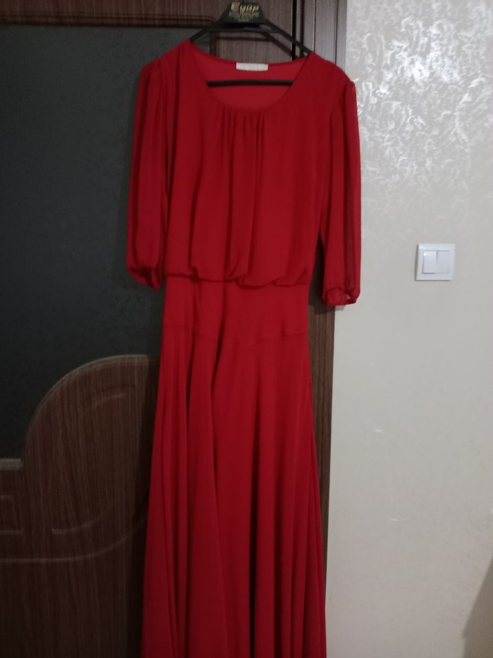 Koyu kırmızı uzun elbise, salaş kesim ve drapeli detaylara sahip. Uzun kollu ve yuvarlak yakalı, yumuşak sentetik kumaştan yapılmıştır. Düğün için uygundur.