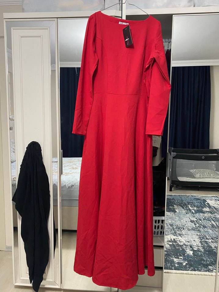 Koyu kırmızı, uzun kollu, salaş kesim, drapeli ve yuvarlak yakalı elbise. 170 boy tam yere sıfır oluyor hiç kullanılmamıs etıketlı