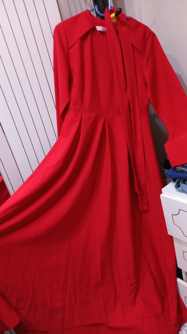 Parlak kırmızı, uzun kollu, salaş kesim kadın elbisesi. İpek gibi yumuşak kumaş ve drapeli tasarımıyla ofis için uygun, çağdaş bir model. ✨bir kere giyildi