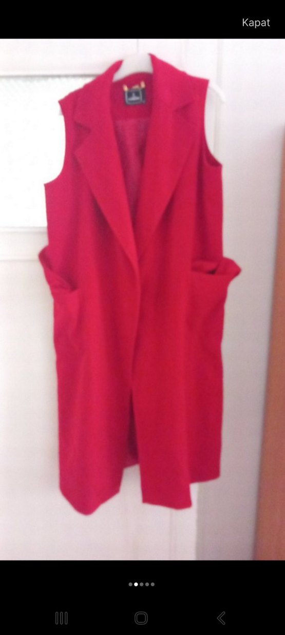 Kırmızı, uzun ve kolsuz bu kadın kabanı, yaka detayı ve salaş kesimiyle ofis için rahat ve şık bir seçenek sunar.