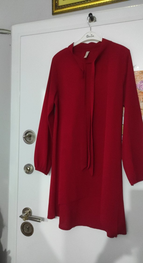 Uzun boy, kırmızı renkli, yüksek yakalı ve uzun kollu, salaş kesim kadın tunik. İpek gibi kumaştan üretilmiş, püskül detayıyla minimal ve çağdaş tarzda. Günlük kullanıma uygun.