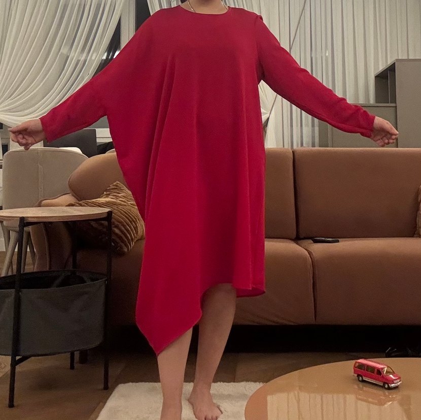 Kırmızı, uzun kollu, V yakalı, salaş kesim midi tunik. İpeksi kumaştan, asimetrik drapeli modern tasarım. Günlük kullanıma uygun.