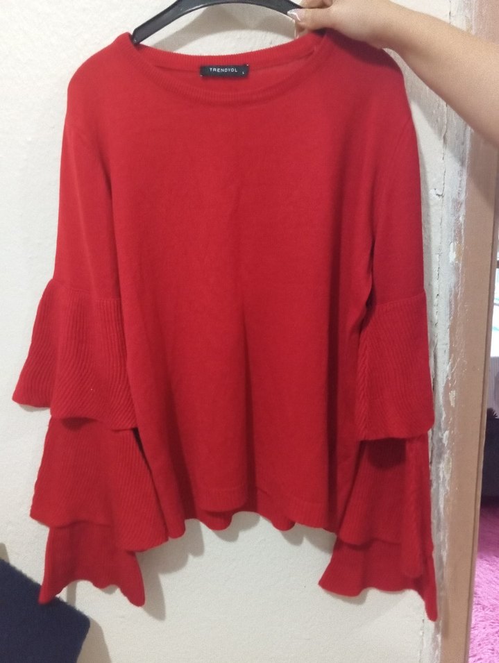 Kırmızı renkli, uzun kollu, salaş kesim örgü kadın kazak. Düz ve rahat yapısıyla günlük sokak stili için uygundur.
