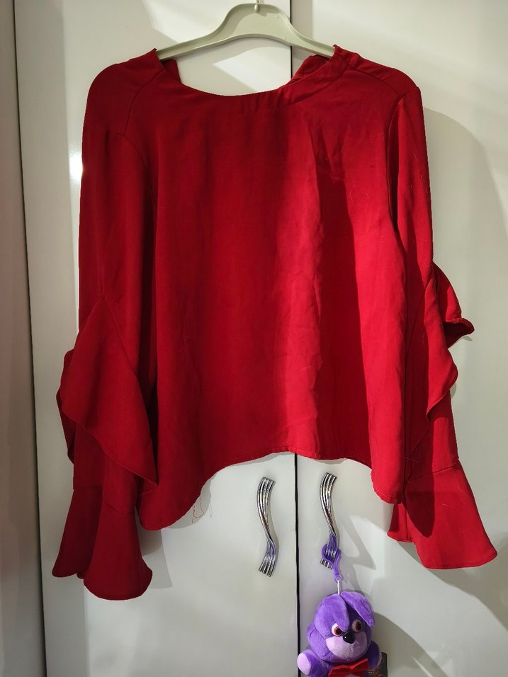 şifon kumaştan, uzun kollu, salaş kesim ve drapeli kırmızı bluz. Yuvarlak yakalı ve parlak görünümlü, günlük kullanım için uygun.