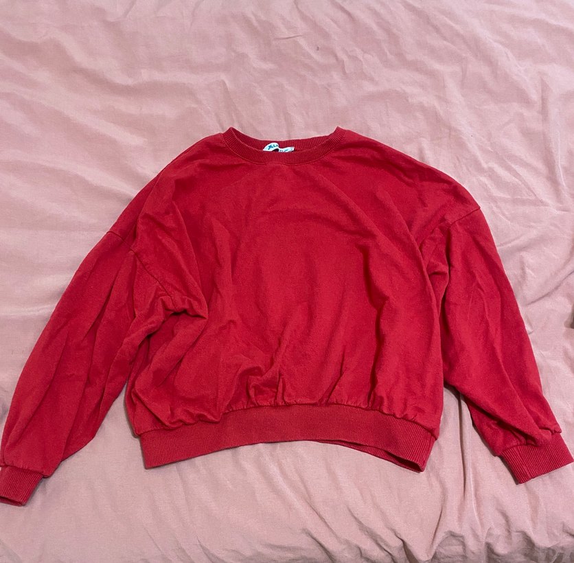 Kırmızı renkli, uzun kollu ve yuvarlak yakalı sweatshirt. Yumuşak ve sıcak kumaştan üretilmiş, salaş kesim ve normal boyda. Günlük sokak stili için sade ve şık bir parça.