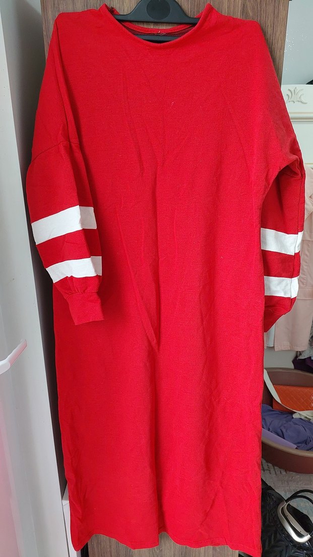 Kırmızı uzun kollu, salaş kesim ve drapeli detaylara sahip tunik. Yumuşak ve sıcak kumaştan, rahat sokak stili için uygundur.