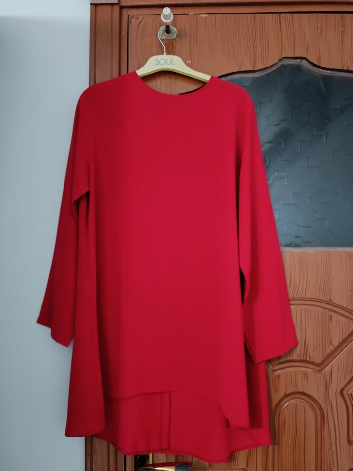 Kadınlar için kırmızı, uzun kollu ve salaş kesim bir tuniktir. İpek gibi dokusu ve drapeli yapısıyla günlük kullanıma uygundur.