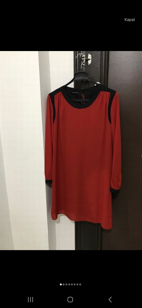 kiremit rengi uzun kollu tunik, salaş kesim ve drapeli detaylara sahiptir. Sentetik kumaştan, minimalist ve çağdaş tarzda günlük kullanım için uygundur. ister tunik ister elbise olarak kullanılabilir, astarlidir, krep kumas sanırım, 90 cm boy