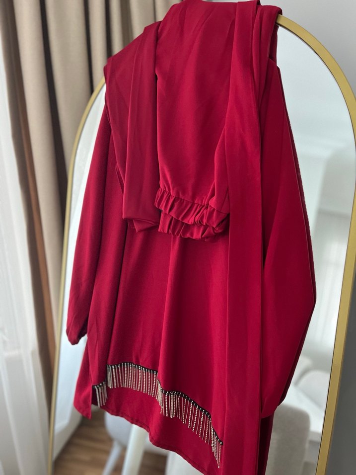 Kırmızı Uzun Kollu Salaş Tunik pantolon şal ve kemerlidir