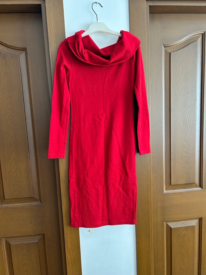 Dar kesim kırmızı triko elbise, uzun kollu ve drapeli yüksek yakalı, yumuşak sentetik kumaştan rahat ve çağdaş bir görünüm sunar. Günlük kullanım için uygundur. Kayık yaka olarakta kullanılabilir.