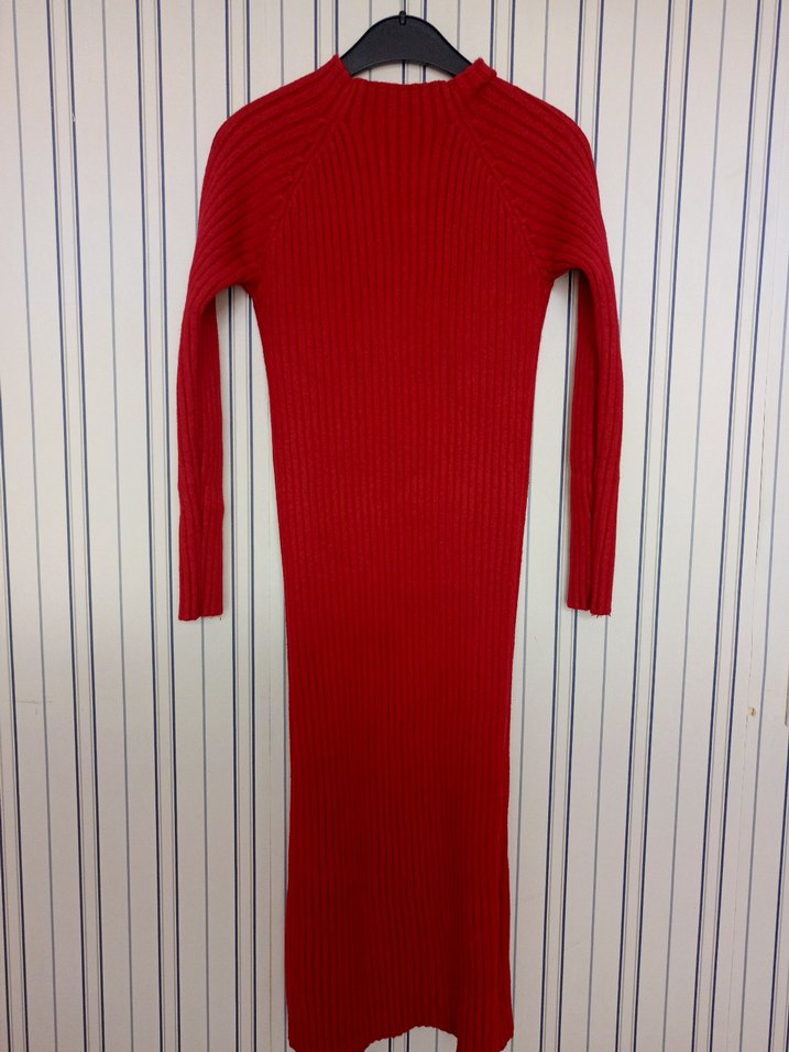 Kırmızı renkli, uzun kollu, triko yapıda, vücuda oturan uzun elbise. Uzun boy, kışlık & baharlık sade, şık. Defosuz.