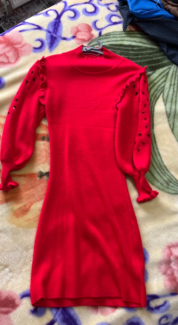 Bu kırmızı uzun kollu triko elbise, delikli detaylı kolları ve yüksek yakası ile rahat ve şık bir sokak stili sunar.