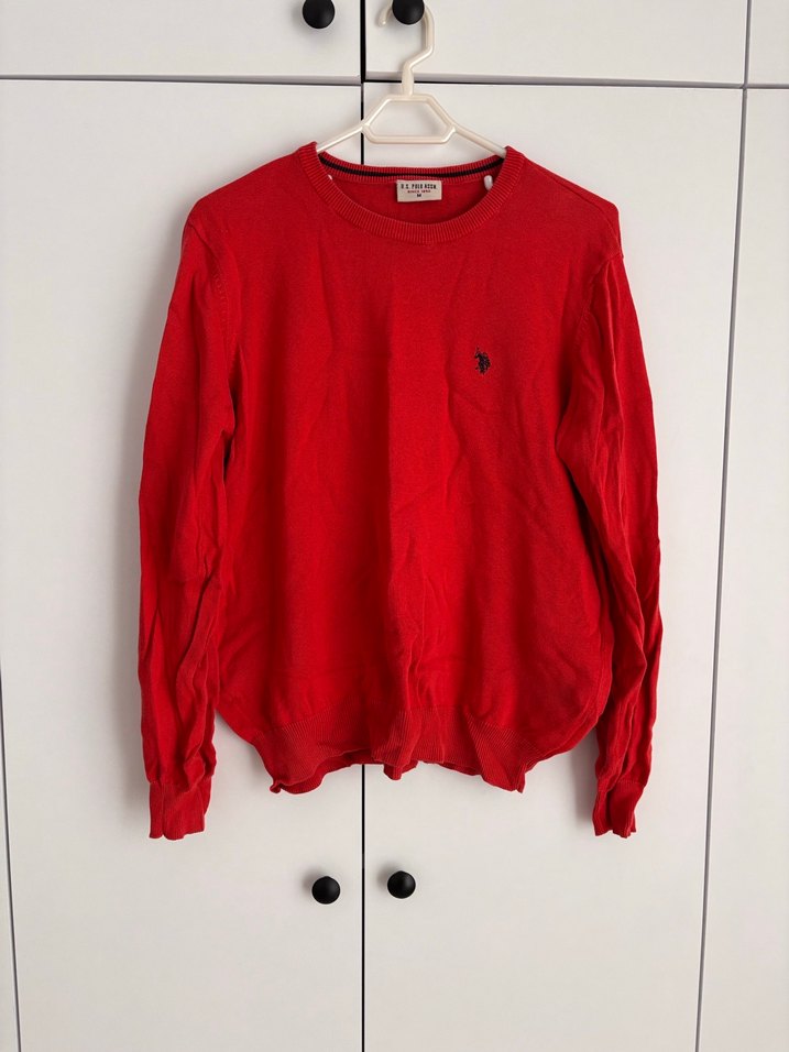 Kırmızı, uzun kollu, yuvarlak yakalı triko kazak. Yumuşak keten kumaştan, parlak ve örme dokuda, rahat kesim. Minimalist ve günlük şık stil için uygun.