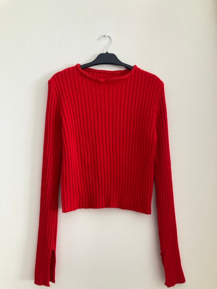 Kırmızı, uzun kollu, triko kumaştan, fitted kesim ve bisiklet yaka kazak. Günlük kullanıma uygun sade ve rahat bir parça. Midi boyda ve desen içermeyen tasarım.