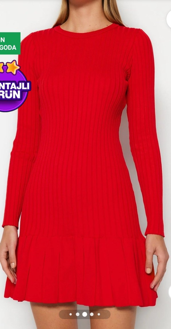 Kırmızı, uzun kollu, triko kumaştan, vücuda oturan midi boy elbise. Yuvarlak yaka ve desen içermeyen tasarımıyla rahat ve cesur bir görünüm sunar. 2 defa kullanıldı temiz