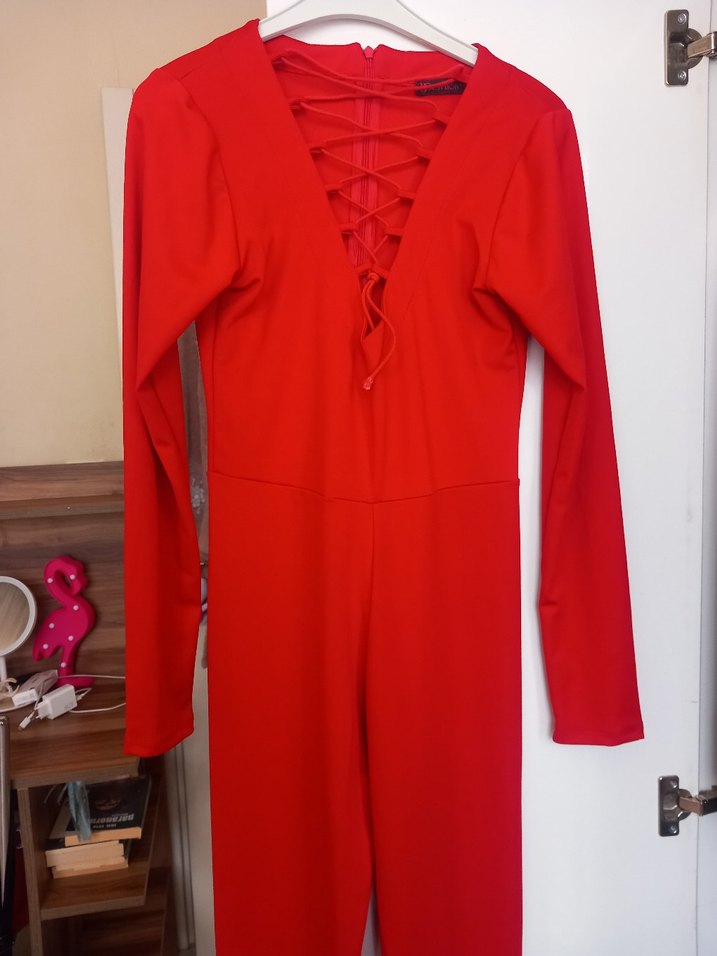 Dar kesim kırmızı tulum, uzun kollu ve bağcıklı V yaka detayı ile. Sentetik kumaştan, şık bir görünüm için yırtmaçlı, romantik akşamlar için uygun.
