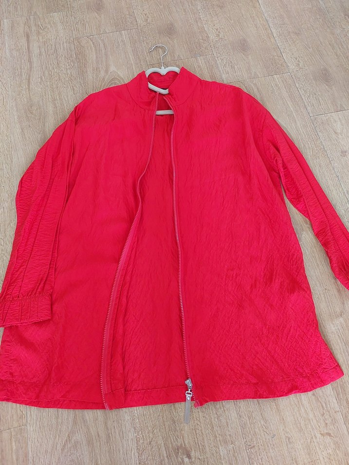 Nefes alabilen kumaştan üretilmiş, yüksek yakalı ve fermuarlı, bol kesim uzun kırmızı ceket. Minimalist tarzıyla günlük kullanıma uygundur. Ürün yenidir bir kaç kez kullanıldı resimlerden anlaşılıyor omuzdan boy 76 cm eni kapalıyken 60 cm kol boyu 50 cm civarı bol kesim mevsimlik kumaş canlı renk