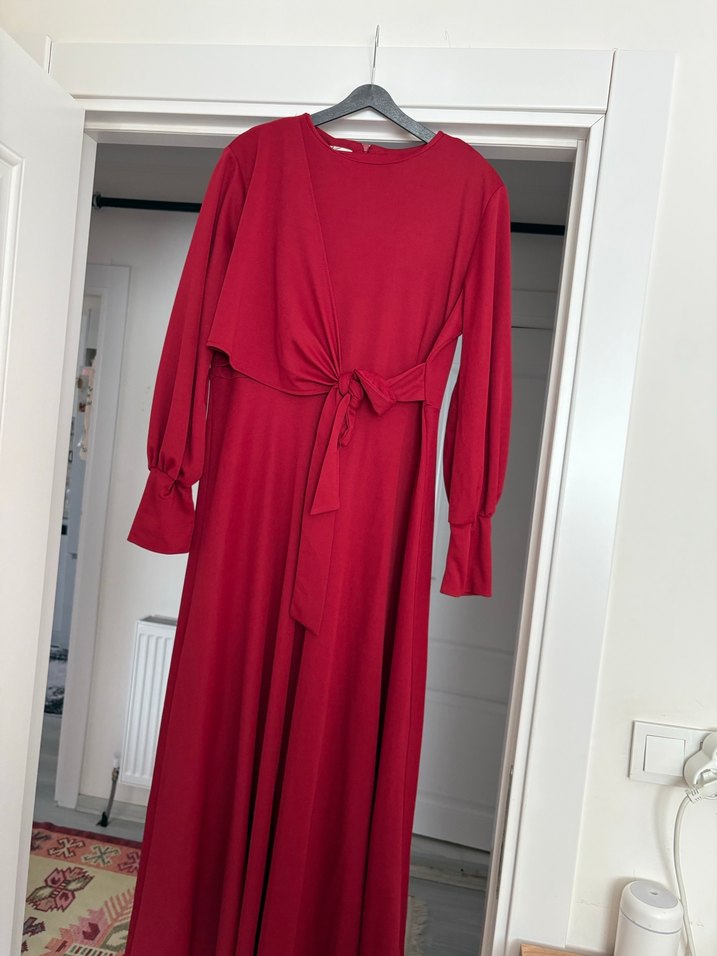 Kırmızı uzun kollu uzun elbise, salaş kesim ve belde bağlama detayı ile drapeli tasarıma sahiptir. V yaka ve sentetik kumaştan üretilmiştir.