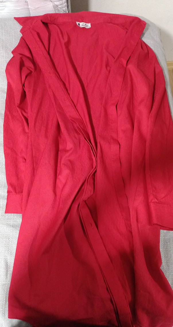 Parlak kırmızı renkte, uzun kollu ve yaka kısmı kesik detaylı, bol kesim ve desensiz hemşire sabahlığıdır.