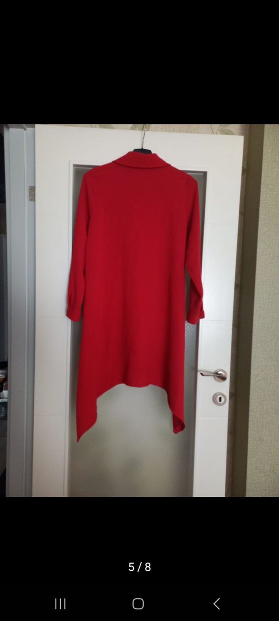 Kırmızı uzun kollu hırka, yüksek yakalı ve drapeli tasarıma sahiptir. Gevşek kesim ve uzun boy, yumuşak ve sıcak kumaştandır.