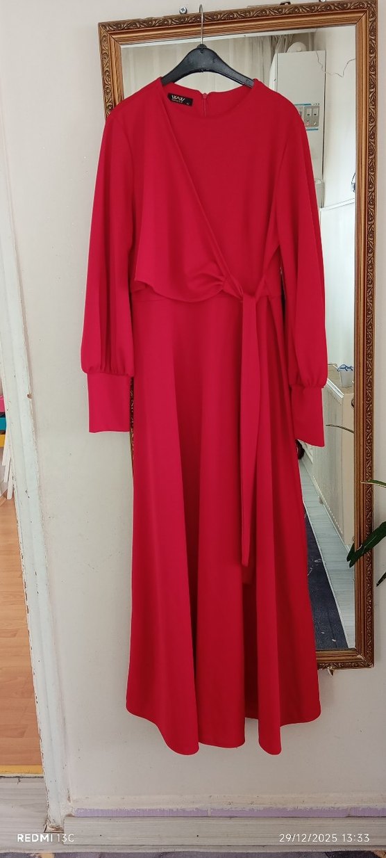 Kırmızı, uzun kollu, V yakalı, salaş kesim, dökümlü ve parlak kumaştan yapılmış uzun elbise. Düğün ve şık günlük kullanım için uygundur.