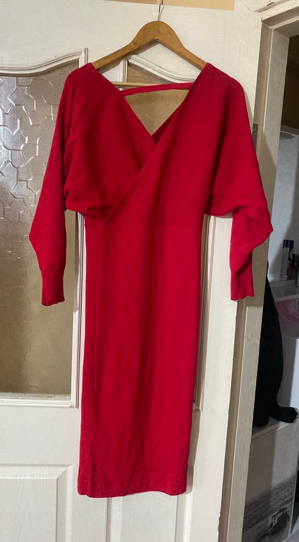 Kırmızı uzun kollu, V yakalı triko elbise, vücuda oturan kesimi ve drapeli tasarımıyla sıcak ve yumuşak kumaştan yapılmıştır. Romantik akşamlar için uygun şık bir parçadır. ❤️