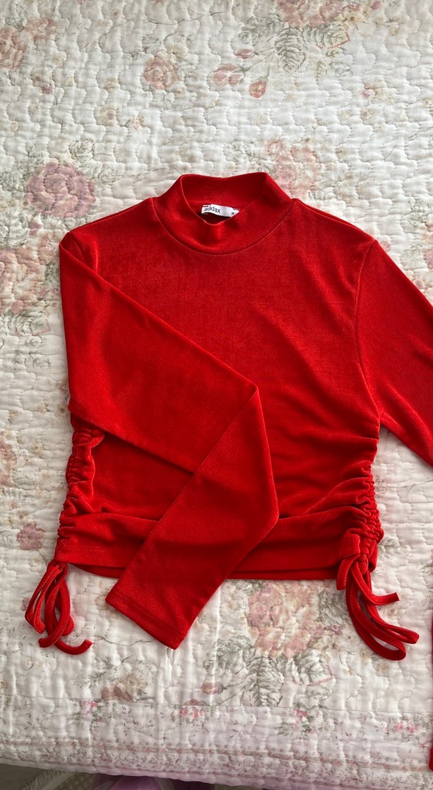 Kırmızı, uzun kollu, yüksek yakalı, vücuda oturan, yanları büzgülü ve bağcıklı kadın bluz. ❤️