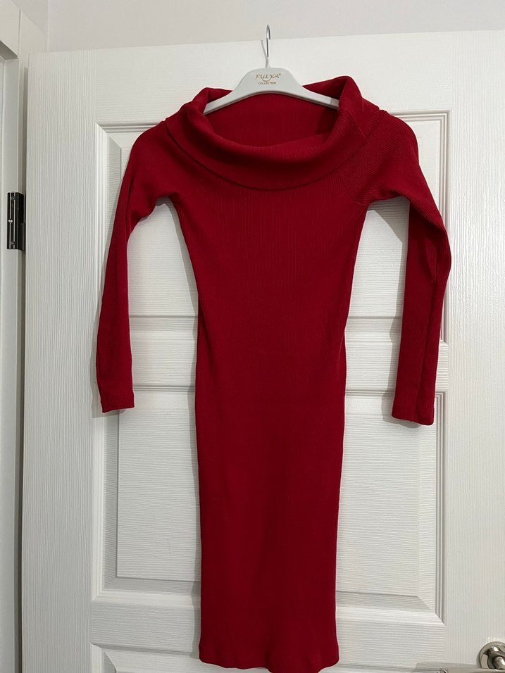 Kırmızı, uzun kollu ve yüksek yakalı triko elbise, drapeli tasarıma sahiptir. Yumuşak ve sıcak kumaştan, minimalist ve çağdaş bir görünüm sunar.