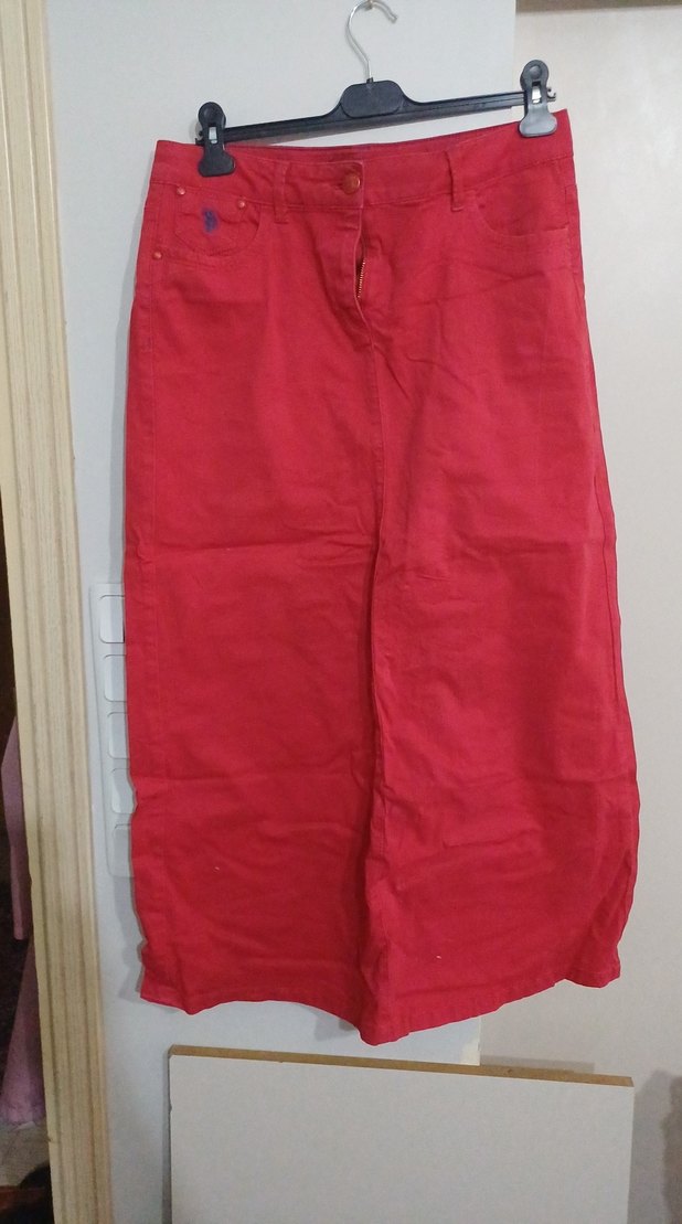 Kırmızı kot kumaştan, salaş kesim uzun etek. Parlak rengi günlük sokak stiline şıklık katıyor.