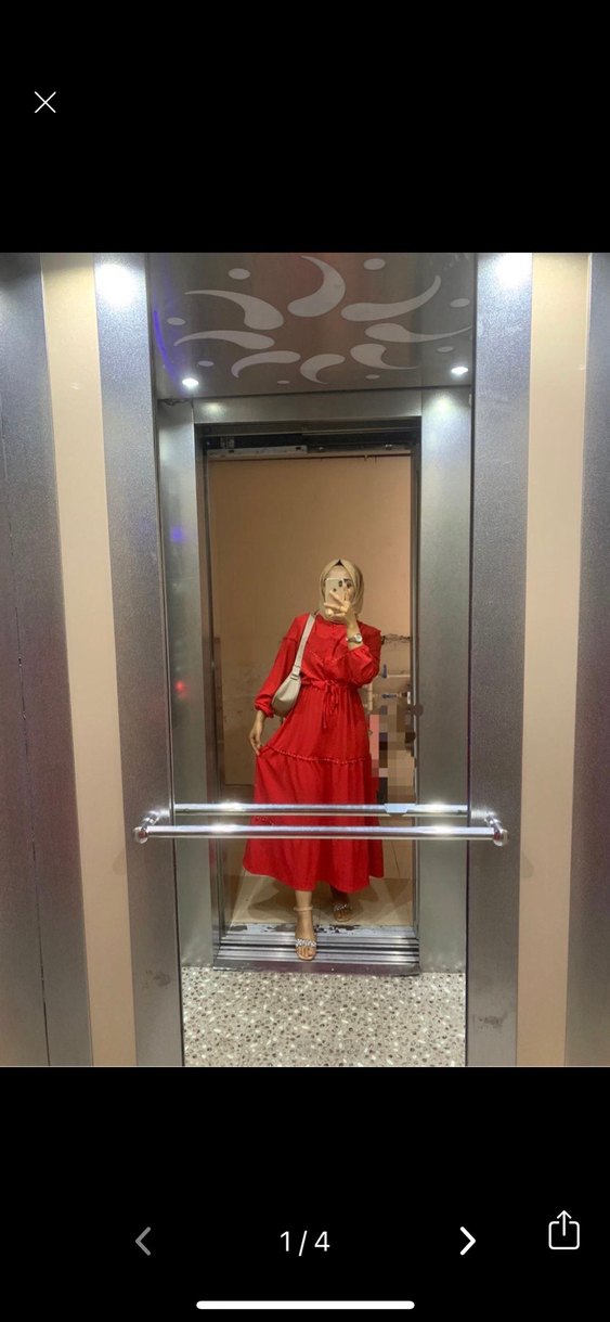 Parlak metalik kumaştan, yüksek yakalı ve askılı kollu, drapeli uzun ve vücuda oturan kırmızı elbise. Modern klasik tarzıyla ofis için uygundur.