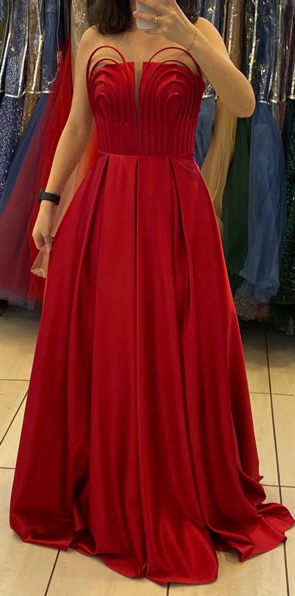 Parlak kırmızı renkte, kayık yaka ve ince askılı, pilili detaylara sahip, bol kesim uzun abiye elbise. Kınamda ve dış çekimde giyilmiştir. 36-38 beden arkası fermuarlı