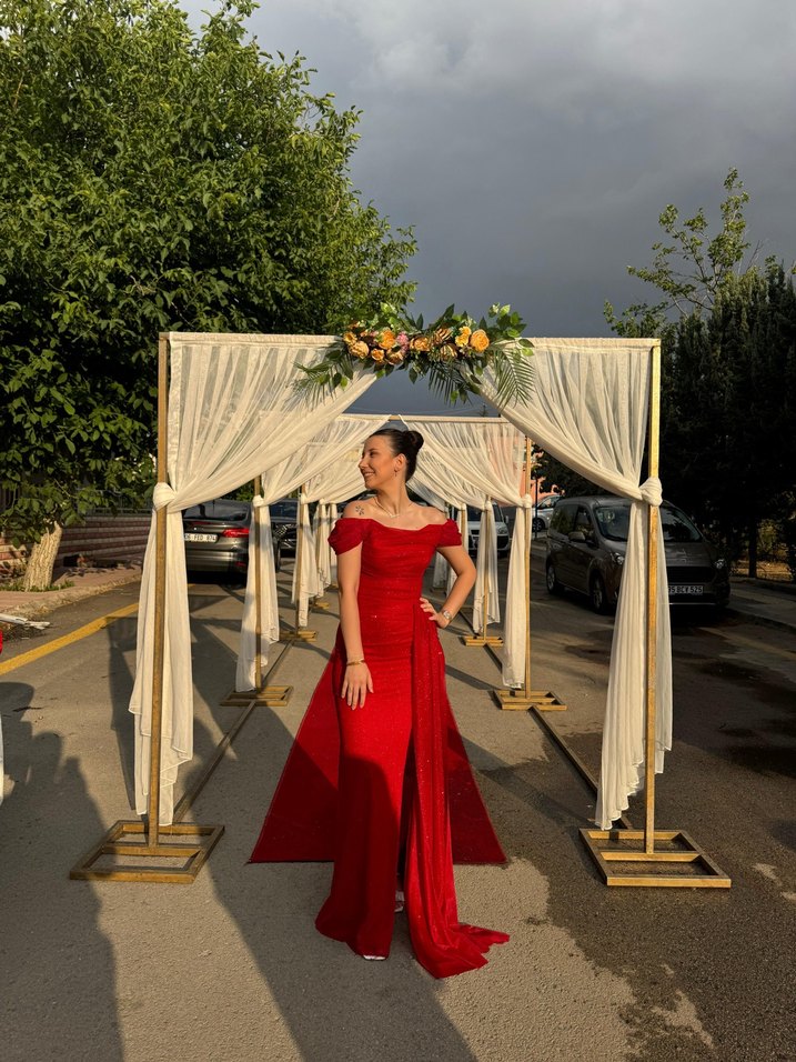 Kırmızı, uzun ve dar kesim abiye elbise, modern klasik tarzda Drapeli detaylarıyla gösterişli bir görünüm sağlar. ✨1 kez giyildi. BySaygı dan alındı