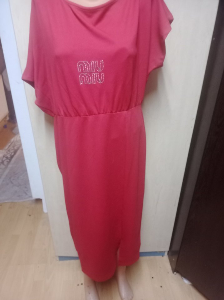 Kirmizi, uzun ve bol kesim elbise, kısa kollu ve yuvarlak yakalıdır. Drapeli tasarım,taşlı detaylı ve parlak yüzeyle sokak ve spor tarzını birleştirir.