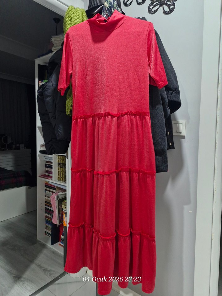 Uzun, bol kesim kadın elbisesi yüksek yakalı ve kısa kolludur. Parlak sentetik kumaştan yapılmış, fırfır detaylarıyla modaya uygun sokak stili sunar. Günlük kullanıma uygundur.