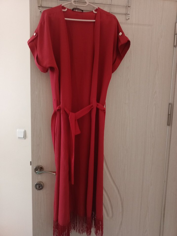Uzun, salaş kesim, kolsuz kadın elbisesi, kuşaklı ve püsküllü detaylıdır. Koyu kırmızı rengiyle bohem Paris tarzını yansıtır.